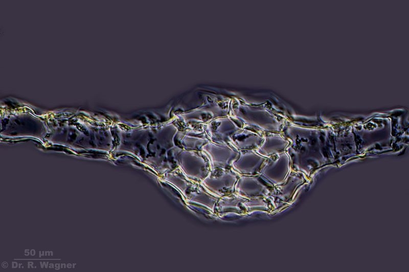 - Thallus, Querschnitt. Thallusrippe nur mit 3 Schichten kleiner Innenzellen, schiefe Beleuchtung.