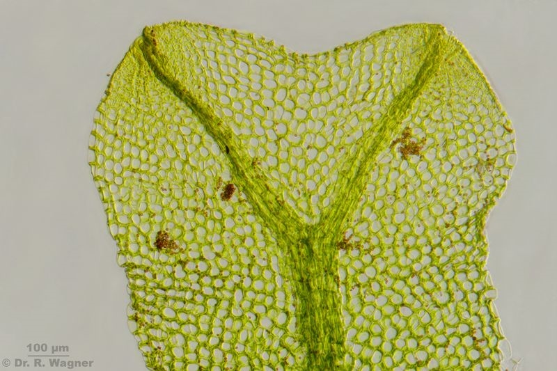 - Thallus gelbgrün, lineal, gabelig verzweigt, 0,5 - 1 cm lang. Thallusrippe nur mit 3 Schichten kleiner Innenzellen, hierdurch von M. conjugata (4 - 6 Schichten) verschieden. Häufig mit Adventivsprossen am Rand und dann bis zur Spitze gleich breit. Stapel aus 290 Bildern, 2,5x Objektiv, 2 Jansjös mit Papierdiffuser