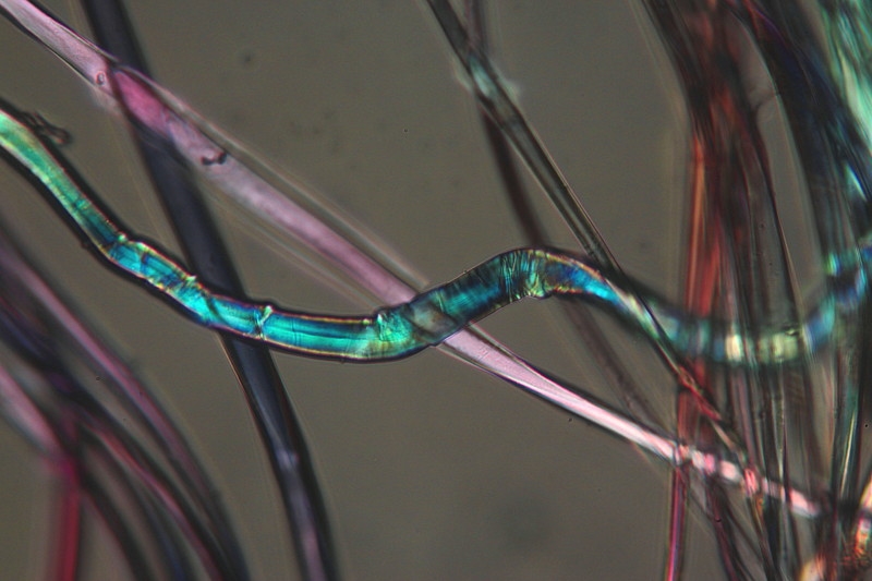 Das untere ist ja bereits ein im Mikroskop erkennbares Gewirk. Aber die Faser? Wenn der Maßstab derselbe ist, käme als natürliche Fasern nur Seide in Frage. Dafür sieht es aber (schier gar) zu gleichmäßig aus ...