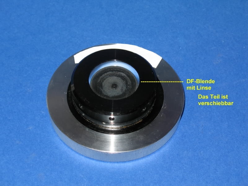 offensichtlich war ich zu schnell mit dem Angebot Fotos zu senden. Als ich heute in das Labor, wo ich diesen DF Zusatz an einem STEMI mal gesehen hatte ging war dieses Stemi verschwunden und das Labor teilweise ausgeräumt (kein Diebstahl sondern die übliche Umzieherei in einem Industriebetrieb). Ich muss Ihnen daher bis auf weiteres das Photo schuldig bleiben, aber das Teil gehört definitiv zu einem Zeiss STEMI DF Durchlichzusatz.