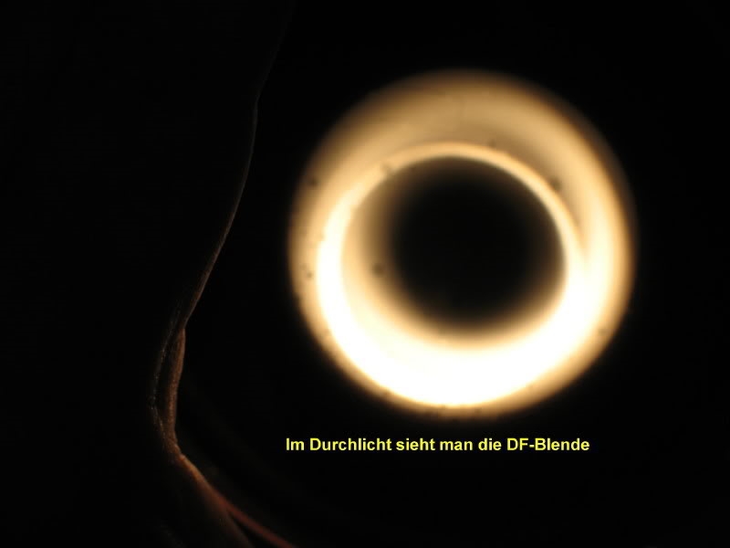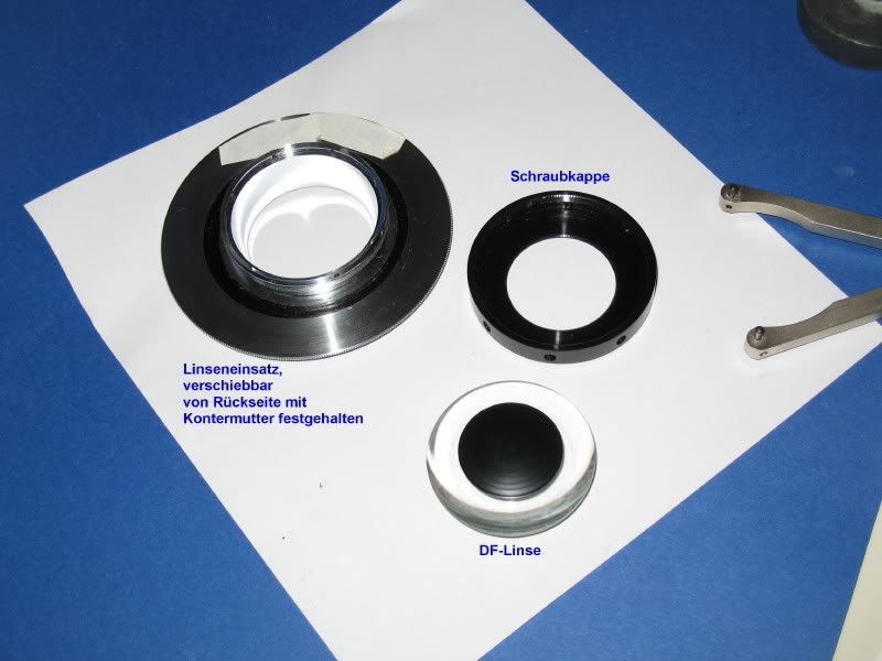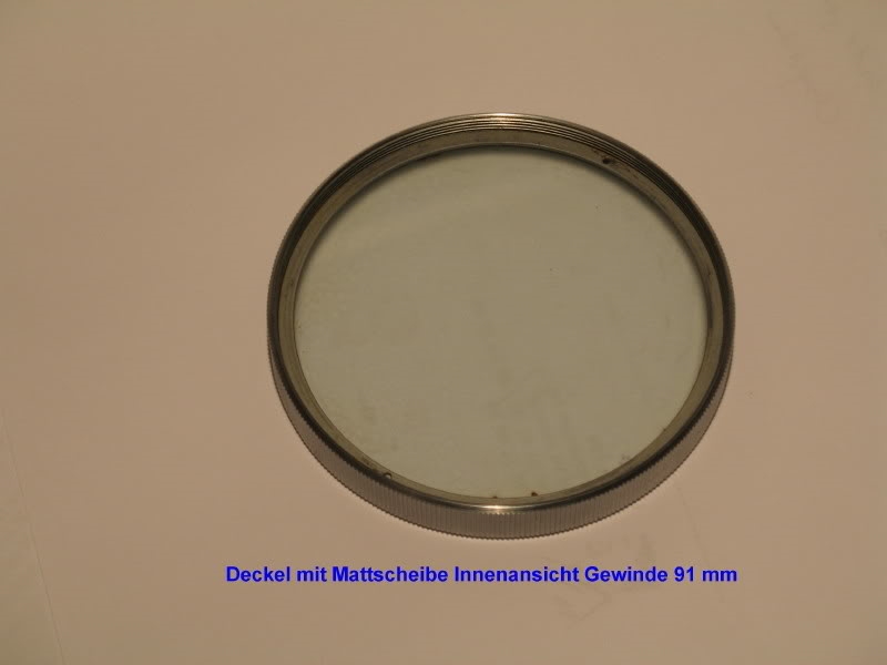 nun habe ich noch 2 Bilder gemacht. Das ist eigentlich eine verschraubte "Schachtel" mit einer runden Öffnung am Boden, durch die der DF-Einsatz durchgeht. Der "Schraubdeckel" ist die große Mattscheibe. Der schwarze Einsatz sitzt passgenau, so dass ich nicht von einer Bastellösung ausgehe.