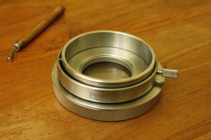 In meinen Kisten habe ich ein Teil gefunden, das eventuell von Zeiss kommt - vielleicht sogar Zeiss-Opton. Die Vermutung wird gestützt, weil ich ein 2. Teil dabei liegen habe das mit Zeiss-Opton gekennzeichnet ist.