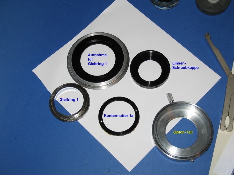 Dieser silberne Einsatz hat ein Innengewinde von 45 mm Durchmesser auf das ein schwarzer Konterring geschraubt wird, der gleichzeitig Gleitring ist??? Kann man erst sehen, wenn man das große Oberteil mit der Mattscheibe abgeschraubt hat!