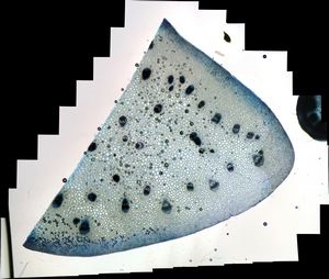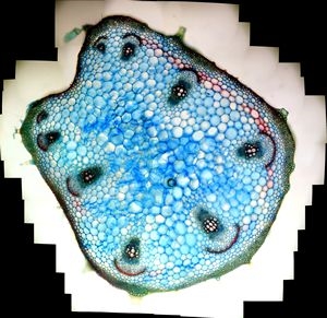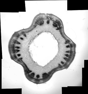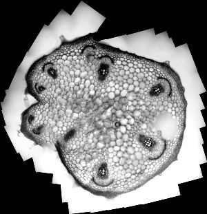 ich habe meine 309 mühevoll geschossenen Fotos vom zugegebenermaßen dilettantischen (ich bin Anfänger) Schnitt des Stängels einer Engelstrompete (auch fälschlicherweise oft als Trompetenbaum bezeichnet) mit Autostitch zu einem schönen Übersichtsbild zusammengesetzt. Nach den bisher relativ guten Ergebnissen mit Autostitch war ich dann doch etwas (sehr  >:() frustriert, als dabei das nach 16 Minuten Rechenzeit rauskam....