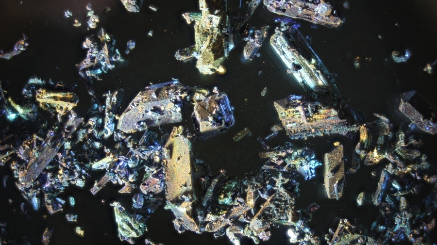 Eine Lösung dieser Kristalle in Wasser ist ja nicht sooo stabil, wird braun (nach einigen Stunden/Tagen). Deshalb vermute ich, dass hier oberflächlich auch die Reduktion in Richtung Mangan IV eingesetzt hat, was sich positiv auf die Intensität der Farbeffekte im pol. Licht ausgewirkt.