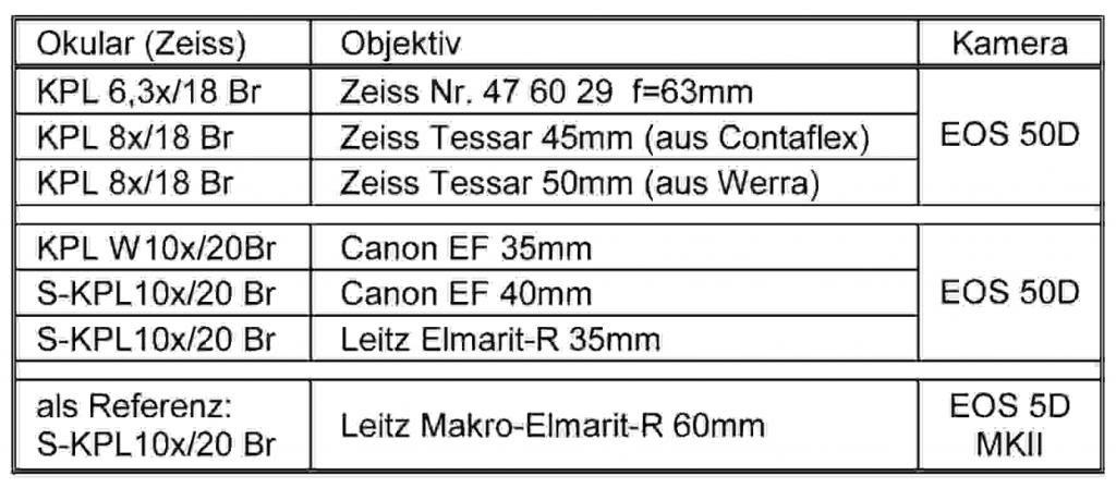 Daher wurde im hier vorgestellten Test versucht, durch entsprechende Kombinationen aus Okular und bildübertragendem Objektiv ("Relaisoptik") die entsprechenden Voraussetzungen zu erfüllen.