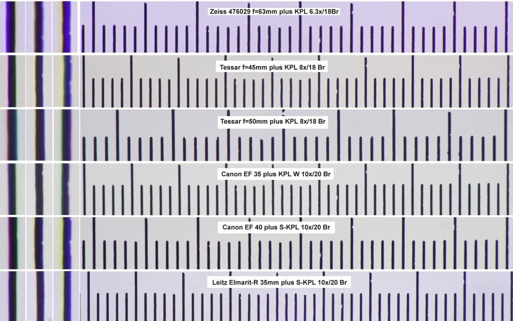 Von jeder im Artikel für den APS-Chip vorgestellten Kombination wurde in diesem Bild hierfür ein Ausschnitt der Abbildung des Objektmikrometers (aufgenommen mit PlanApo 25/0.65) in der Größe 1676 x 200 Pixel gezeigt, und zum Vergleich an der linken Bildseite jeweils der äußerst linke, der mittlere und der äußerst rechte Strich in einem ca. 3x vergrößerten Ausschnitt, ursprünglich 30 x 60 Pixel groß.
