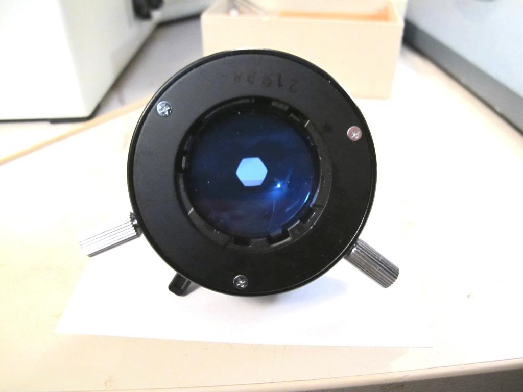 dieser sollte sogar von Olympus sein und er hat Steckdurchmesser 36,8. Da könnte man den eingesteckten Blaufilter entweder direkt verwenden, oder durch ein weißes Klarglas ersetzen, dann etwas probieren mit dem Durchmesser eines Zentralpunktes aus erst mal schwarzem Filzstift und wenn man den richtigen Durchmesser hat einen schwarzen Punkt aus Selbstklebeetiketten aufkleben.