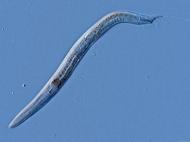 Caenorhabditis elegans ist wirklich ein Überlebenskünstler und auch sonst ein bei Wissenschaftlern durchaus beliebtes Unersuchungsobjekt. Dazu ein Bild, das ich schon vor einigen Jahren aufgenommen habe: