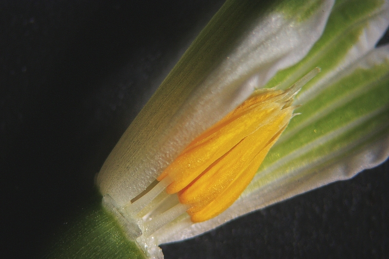 Die duftende,zwittrige Blüte besteht aus dreizähligen Blütenblattkreisen.Die Blütenhülle besteht aus 3 weißen äußeren und 3 verwachsenen grünweißen inneren Blütenhüllblättern,2 x 3 spitzkegelförmige Staubblätter stehen dicht zusammen.Die Bestäubung erfolgt durch Insekten.