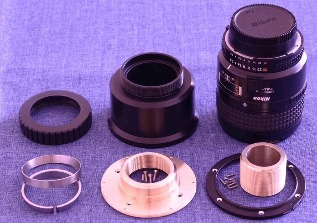 Nachstehend werden die einzelnen Teile der Adaption im Bild vorgestellt. Der Adapter beruht auf der Klemmverbindung, die bereits vom Zeiss-Tubus bekannt ist, jedoch ist der Original- Klemmtubus von Zeiss (Nr. 47 60 05) leider zu lang, um zusammen mit dem Nikon-Objektiv verwendet werden zu können.