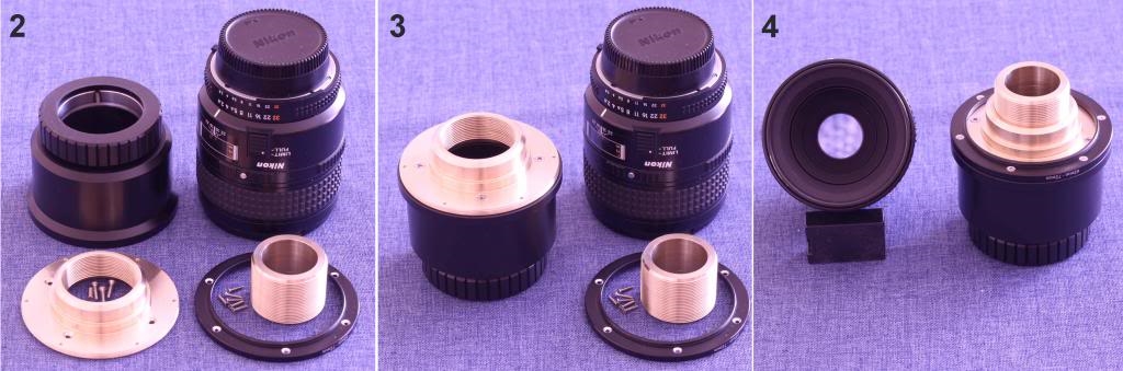 2-4: Montage der Flitergewinde-Kupplung und des Gewindezylinders für die Höhenverstellung, links ein Blick auf das Micro-Nikkor von vorn