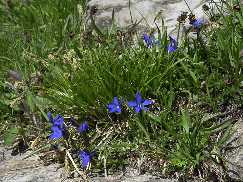 Die Polster-Segge Carex firma ist namensgebend für diese Pflanzengemeinschaft mit dem Frühlings-Enzian Gentiana verna.