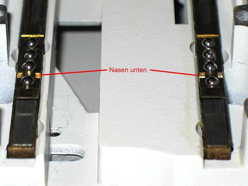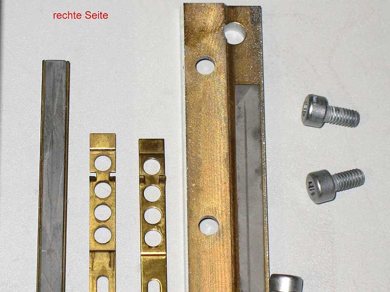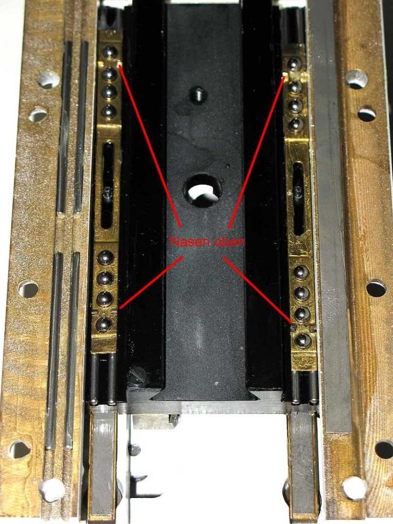 5. untere Lagerführung, nach Entfernen des Schlittens. Die Messingstreifen besitzen abstehende "Nasen" (Abstandshalter), deren Lage auf den Fotos beschrieben ist.