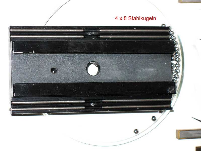 3. hier sind die Druckplatten zur Seite geklappt und man sieht die obere Lagerführung ( zwei Messingstreifen/-käfige mit je 8 Lagerkugeln ) auf dem schwarzen Schlitten.
