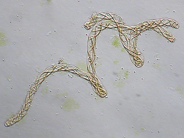 Pellia epiphylla, Elateren; deutlich sind die spiralisierten Zellulosefibrillen zu sehen.