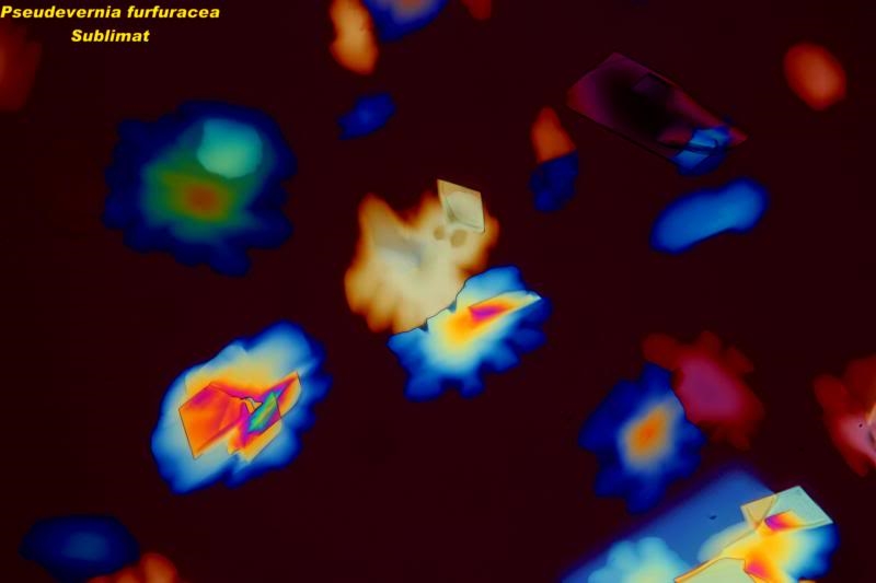 Inzwischen hat mir Felix Schumm ein "wenig" Literatur geschickt und damit meinen naiven Glauben, man könne nach dieser Methode einfach Flechteninhaltsstoffe identifizieren nachhaltig erschüttert. Es sind inzwischen ca 1000 Substanzen identifiziert. Davon sublimieren sicher ein paar unzersetzt, aber viele sind ziemlich labil und es sind oft komplexe Gemische. Die Methode der Wahl ist heute Dünnschichtchromatografie und die manchmal 2-dimensional um bessere Trennergebnisse zu erzielen.