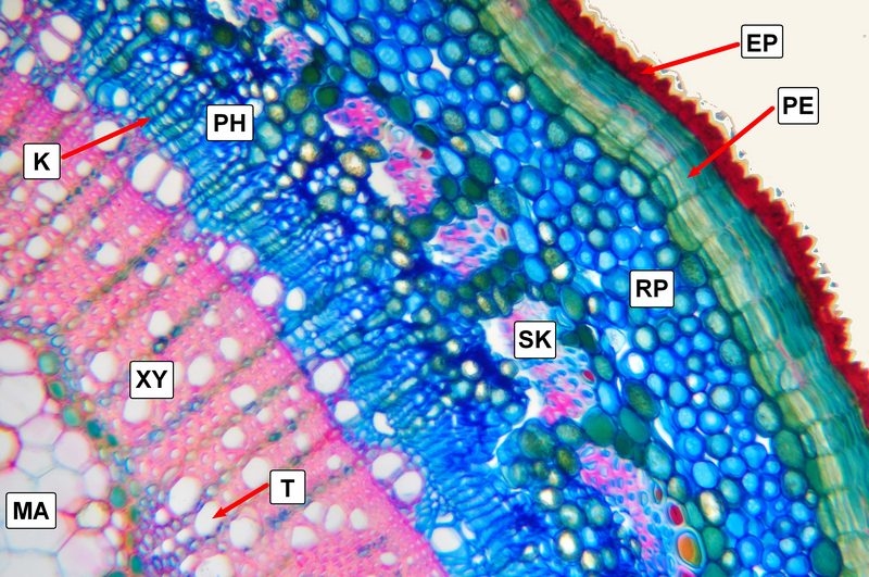 K = Kambium, MA = Markparenchym, XY = Xylem, PH = Phloem, T = Trachee, SK = Sklerenchym - Inseln, RP = Rindenparenchym, PE = Periderm, EP = Epidermis