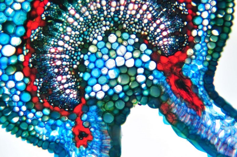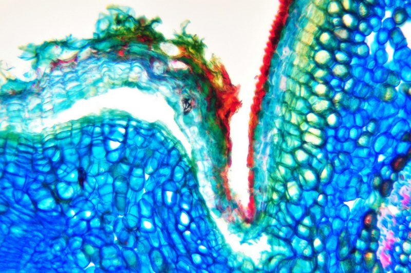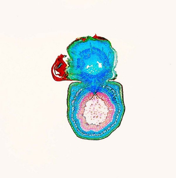 Zellwände blaugrün bis grün, verholzte Zellwände leuchtend rot, Zellwände der äußeren Hypodermis orangerot, Cuticula gelb, Zellwände der innenliegenden Hypodermis tiefrot.