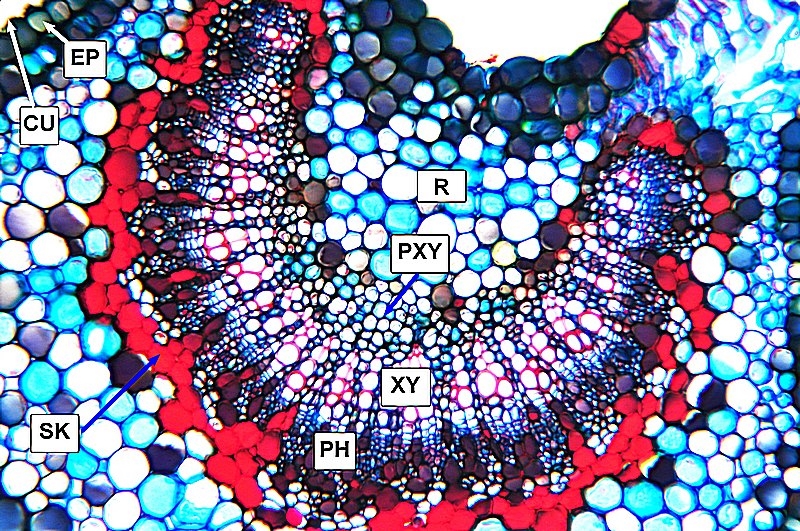 CU = Cuticula, EP = Epidermis, SK = Sklerenchym, PH Phloem, XY = Xylem, PXY = Protoxylem, R = Rindenparenchym