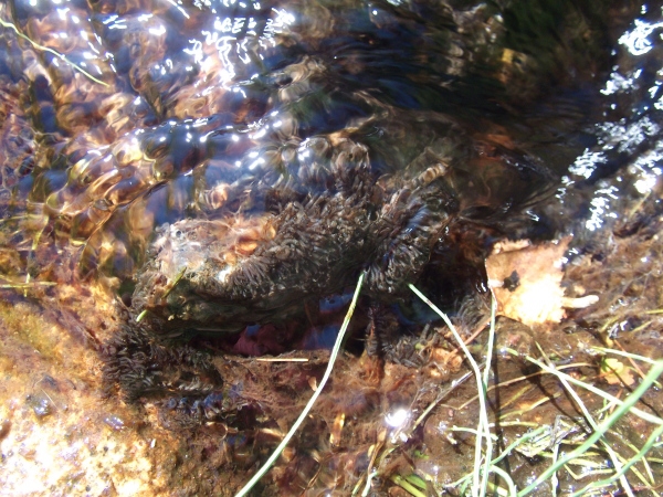 heute habe ich etwas größeres vor der Linse gehabt. Von Weitem sah es wie ein Pflanzenbewuchs aus, bischen braun-grau. Da könnten Diatomeen im Spiel sein, dachte ich und wollte etwas davon pflücken:
