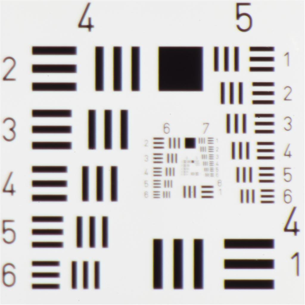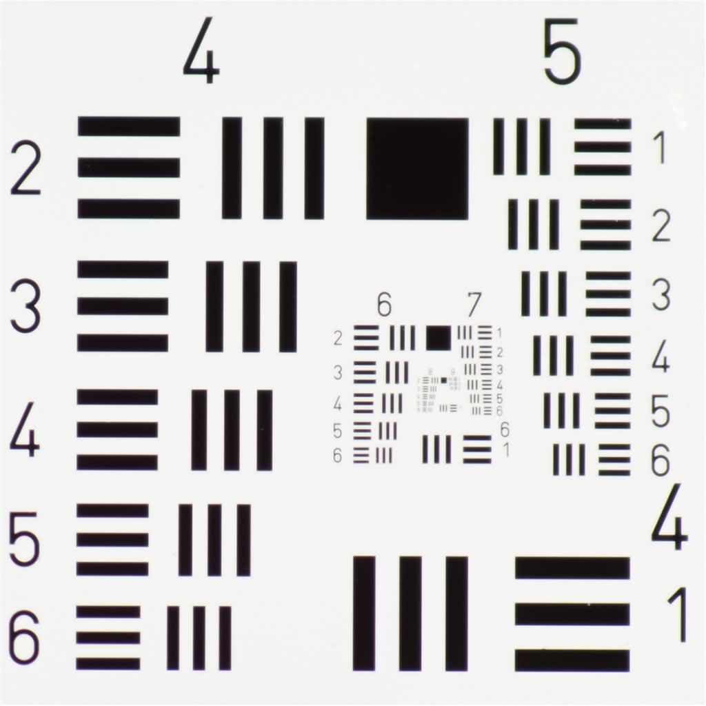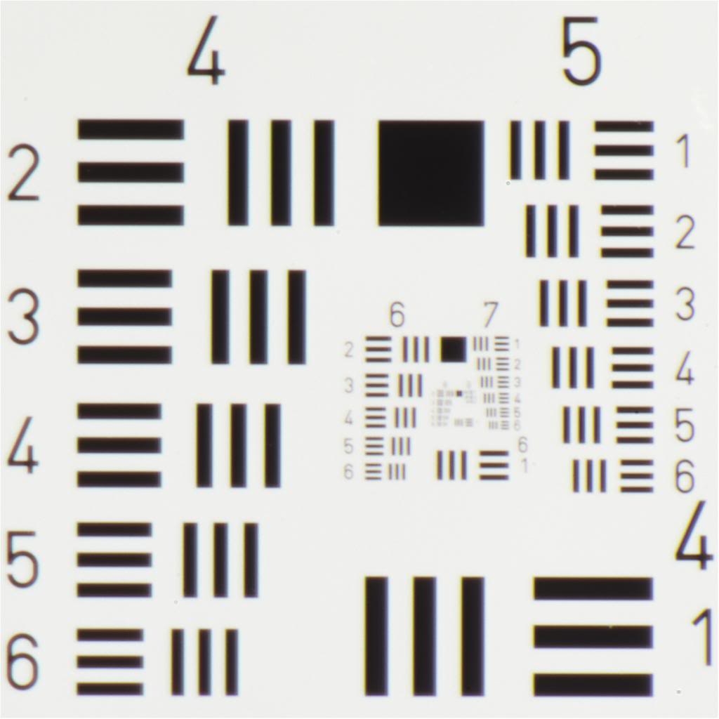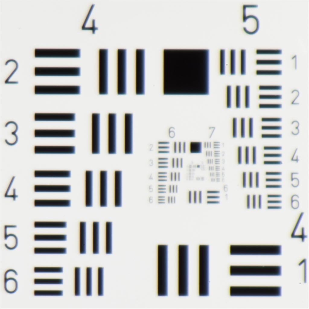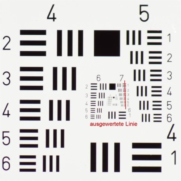 Das Test-Traget ist ein 1951 USAF Auflösungstest-Target (Chrom auf Glas), welches mit 250mm Distanz zur Sensor-Ebene aufgenommen wurde (Bezugsquelle Edmund Optics)