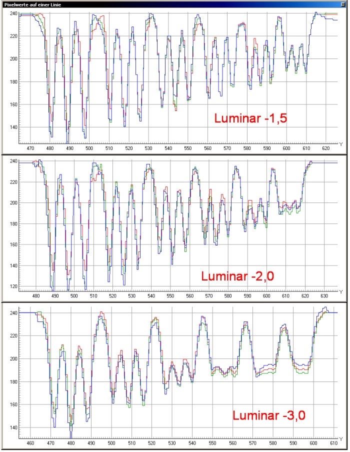 Das Luminar hat das beste Ergebnis bei -1,5 Blendenwerte. Weiter geöffnet zeigt sich, dass es ein reales und kein theoretisch bestes Objektiv ist. Bei -2 bis -3 Blenden schlägt die Beugung gnadenlos zu.  :D