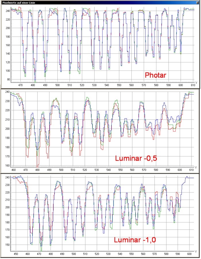 Beim Photar liegen wir bei der Auflösung in der Gruppe 8, 287 lp / mm werden noch gut aufgelöst - beim Luminar in der Gruppe 7, 203 lp / mm (meiner Meinung nach) ...
