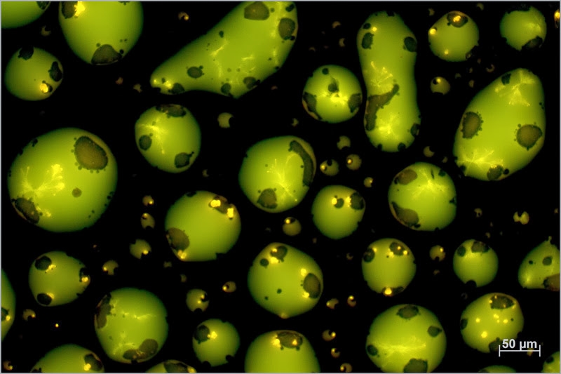 Bild 3 Auflichtfluoreszenz mit Blauanregung (Primärfluoreszenz), erhitzter Niederschlag vom Inhaltsstoff des vertrockneten Stängelbruchs vom Schöllkraut (Chelidonium majus)