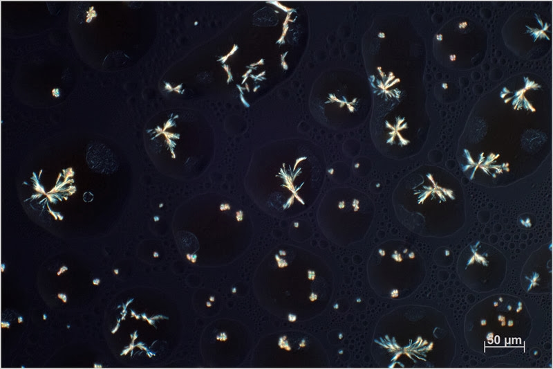 Bild 4 Durchlicht-Pol (gekreuzte Polfilter), erhitzter Niederschlag vom Inhaltsstoff des vertrockneten Stängelbruchs vom Schöllkraut (Chelidonium majus)