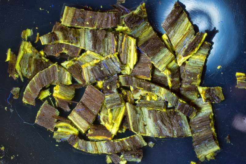 Ein ca. zwei Zentimeter langes vertrocknetes Stängelstück wurde mit einer Nagelschere zerkleinert. Um abzuschätzen was eventuell zu erwarten ist, habe ich den Bruch mit einer 3 Watt 365 nm UV-Taschenlampe beleuchtet. Die nachstehende Aufnahme gibt ganz gut den visuellen Eindruck wieder. Das intensive Gelb lässt auf noch aktives Berberin vermuten.