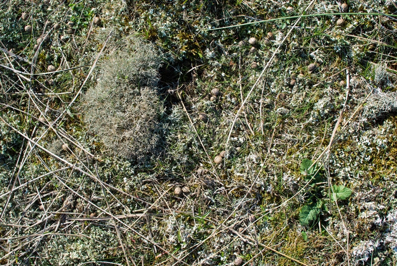 @All, etwas habe ich noch. Auf der Insel gibt es auch reichliche Flechtenvegetation. Neben Xanthoria sp. findet man vornehmlich in offenen Flächen der Dünen-Gebüschvegetation die Cladonia portentosa (Ebenästige Rentierflechte).