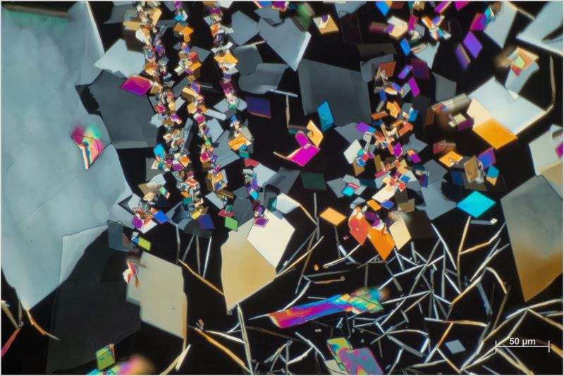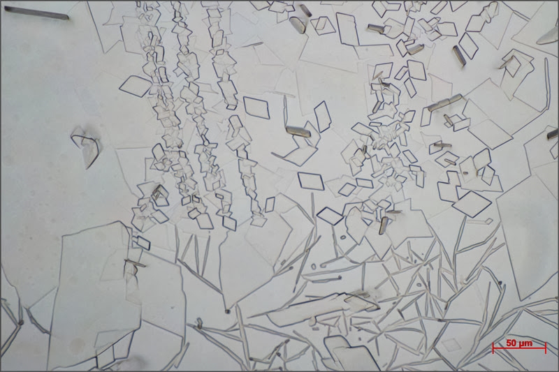 Dieses ist nur ein Ausschnitt der Vielfalt von Auskristallisationen. Wenn ich mir beim Durchmustern die verschiedenen Kristallformen ansehe, dann ruft es schon fast nach fraktionierender Sublimation.