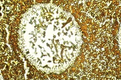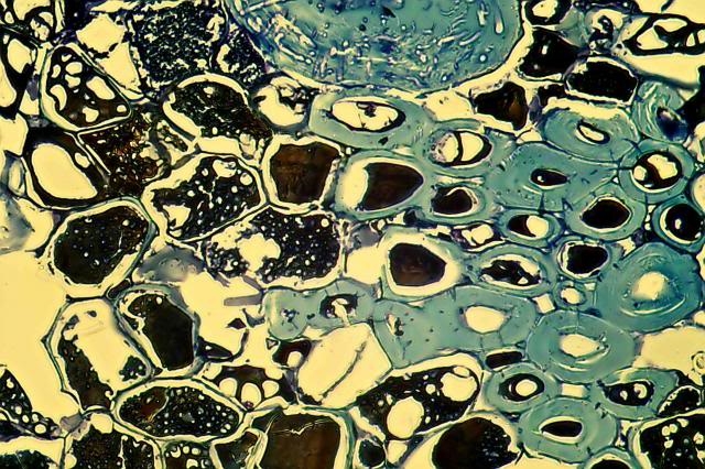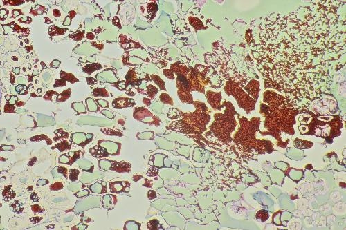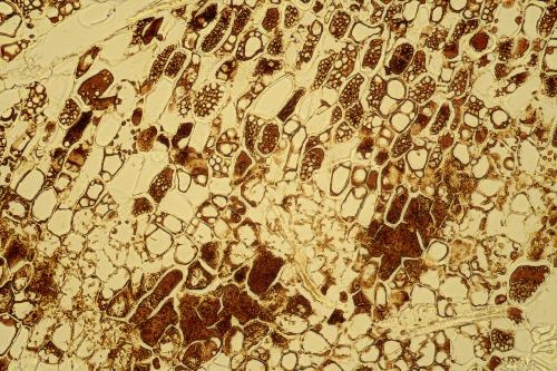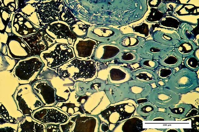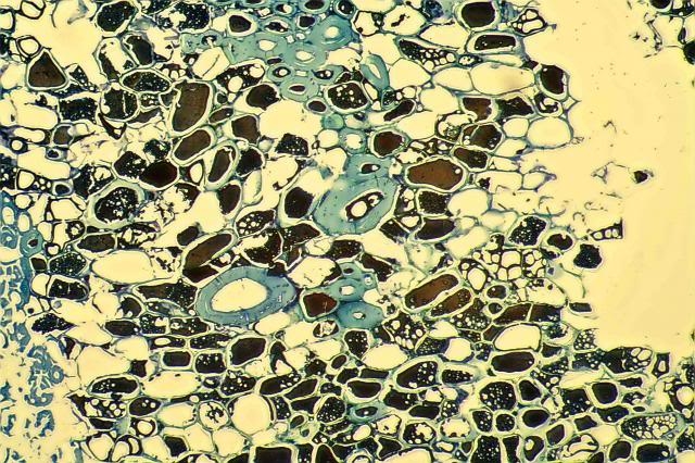 When looking in Etzold stained slides we can see  a little more . In the right upper corner you will see loose hyphae, which are aggregated in the structures towards the centre, that give the impression that they were formed within cells although no walls are visible. The foam like structures within cells are not simply holes in sieve plates as  they also occur within the lumen of fibers ( will be shown asap) but rather bubbles within a melanin depot. This is hypothetical but the massive presence of fungi and the obvious degradation of the fiber tissue which should be accompanied by high CO2 production makes me think that melanin is formed and solidified while CO2 is produced, resulting in bubbles.