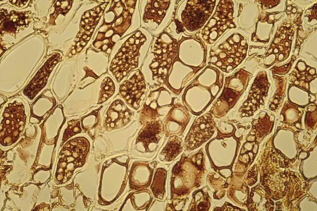 I wish it were that easy. Chaga is a case of pure pathology and the original structure of the host is destroyed. The Inonotus conk is produced from the bark upon severe infection by the fungus that invades phloem vessels and causes parenchymal cell occlusions (Blanchette, 1982). What is seen here  is a late result of disease. We can recognize sklerenchyme fibers (light blue) and dark brown cell contents, even in the lumen of the fibers. Most likely this is melanin.