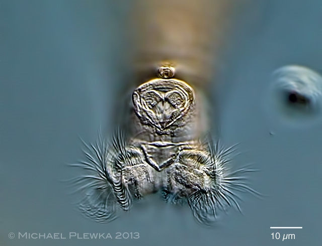 mit diesem Bild der Frontalansicht eines bdelloiden Rädertiers (Otostephanos torquatus) möchte ich auf diesen und weitere Funde von Rädertieren hinweisen: