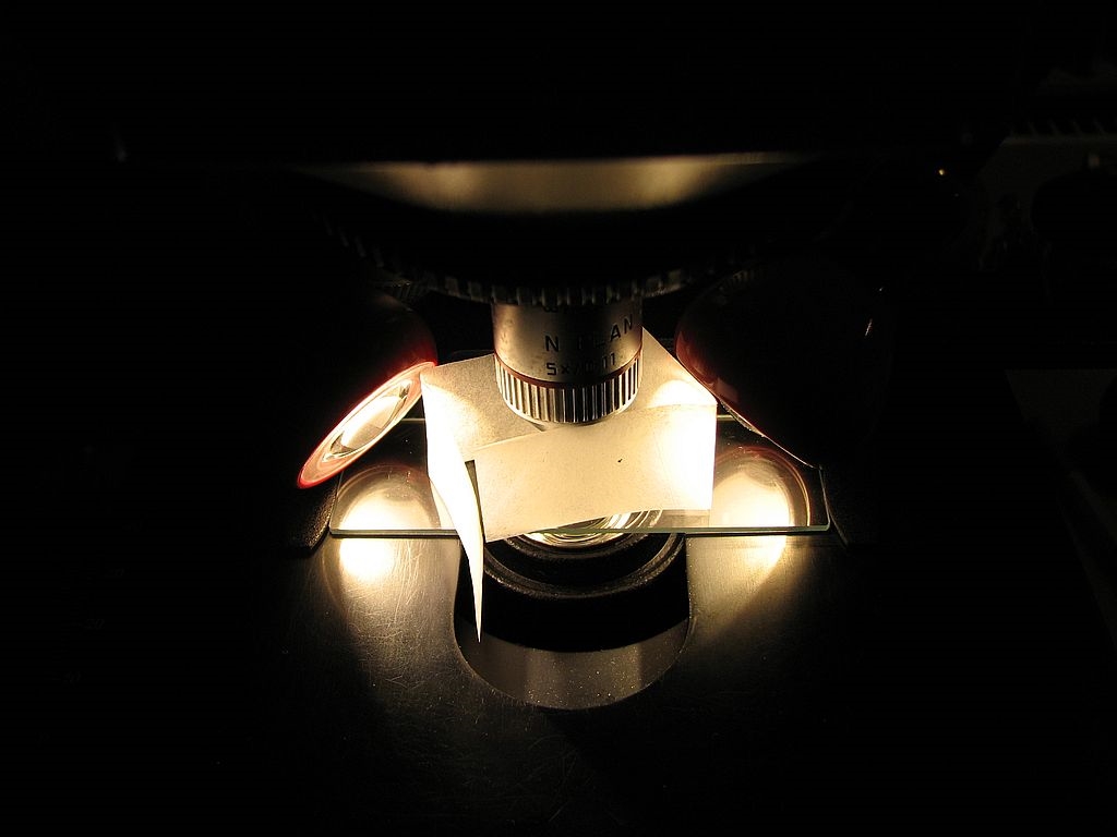 Die Einlegeblättchen der BMS-Objektträger sind übrigens nicht nur als einfacher Diffusor zu gebrauchen. Sie machen sich auch gut als Präparat. Einfach mit Isopropanol durchfeuchten und dann mit Euparal eindecken. Besonders im Pol sind sie durchaus interessant.