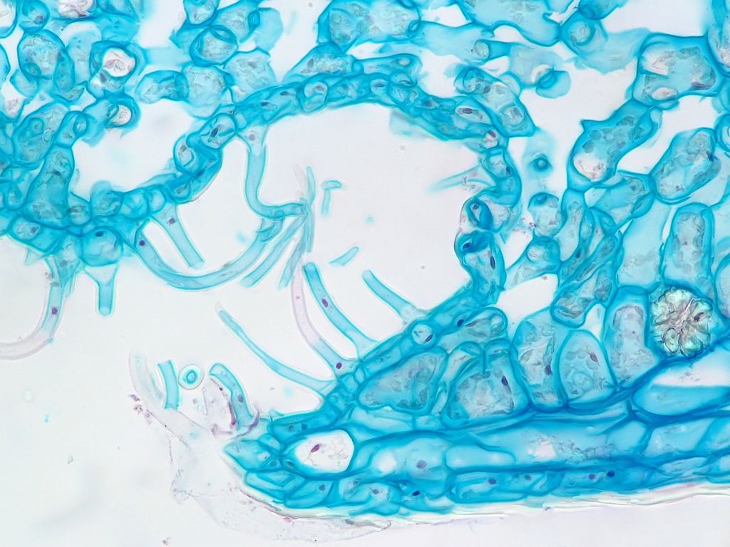 Das frische Blatt wurde in Möhreneinbettung auf dem Handzylindermikrotom mit DurAedge Einmalklingen im SHK-Klingenhalter geschnitten. Die Schnittdicke beträgt ca. 50 µm.