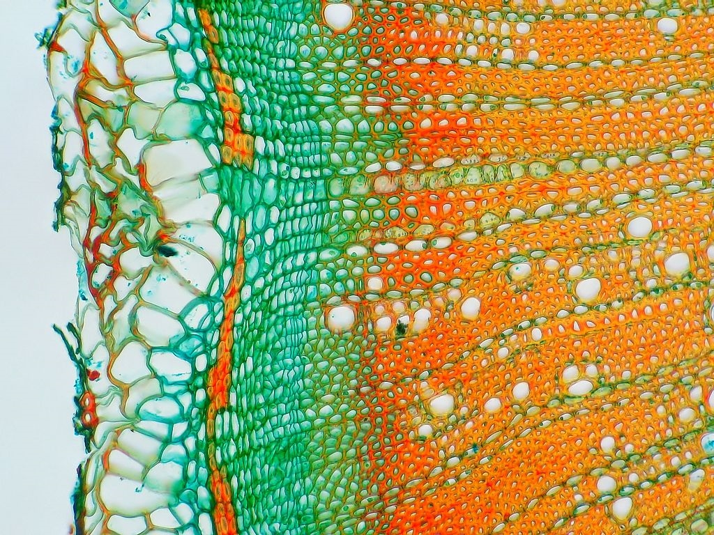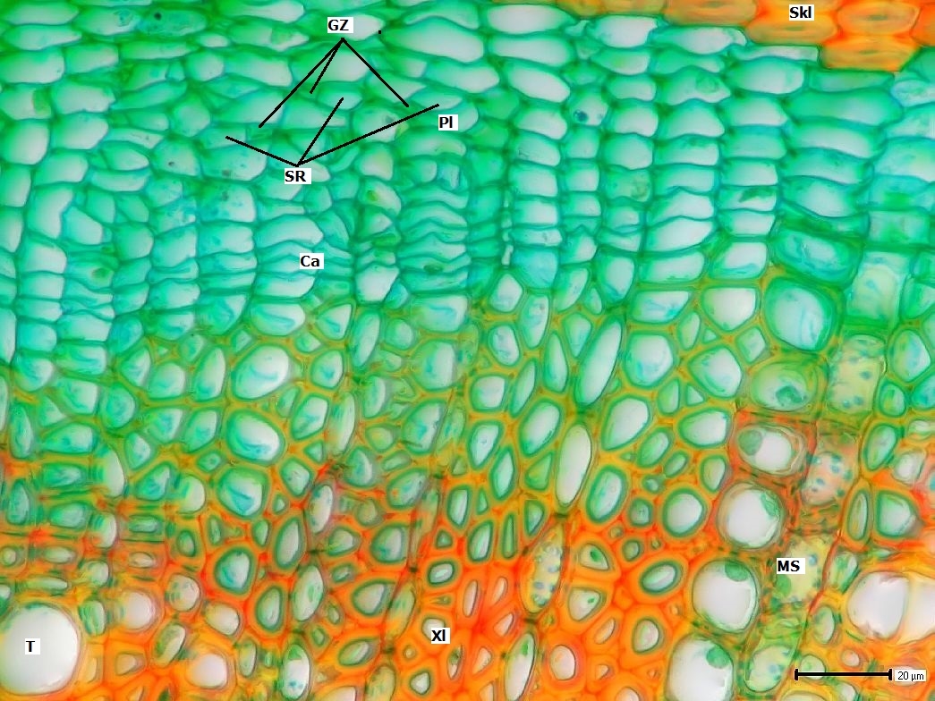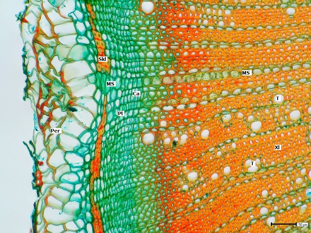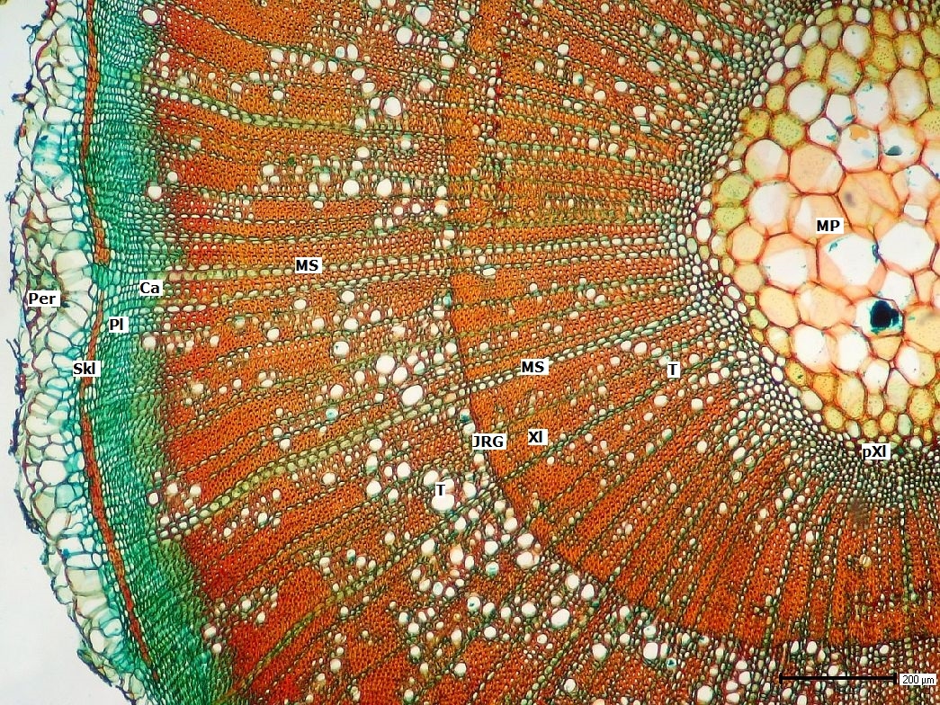 Auch hier hilft bei der Deutung der Beschriftung die weiter oben verlinkte Tabelle. Im Phloem sind Siebröhren und Geleitzellen zu erkennen, leider habe ich jedoch in keinem der Schnitte eine fotogene Siebplatte entdecken können.