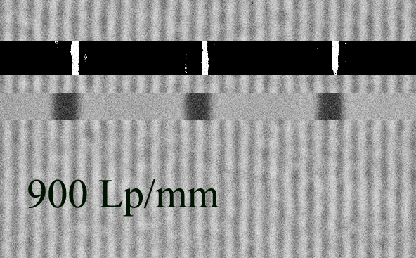 Ein Vergleich mit einer 1/100 mm Skala ergibt allerdings eine Auflösung von 900 Lp/mm.
