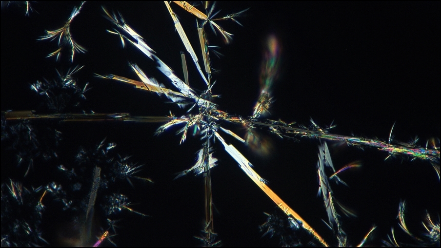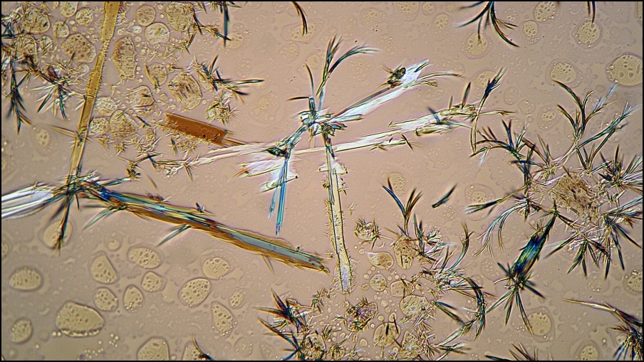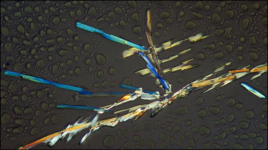 ... die allgegenwärtig auf den verschiedensten mineralischen Substraten zu finden ist, lohnt es, liebe ,,Sublimanten", auf die Knie zu gehen. Die Thalli sind wahre Chemie-Fakriken und die nach vorsichtiger Sublimation erhaltenen Tröpfchen kristallisieren unter dem Deckglas munter weiter: