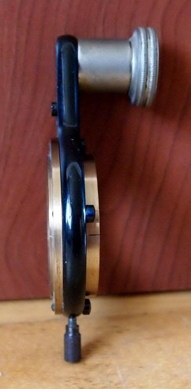 Es scheint, daß der Kondensorarm verbogen ist. Er ist warscheinlich aus Messingguß, also ziemlich spröde. Kondensor abschrauben, die Verstellschraube auch entfernen. An dem übrig gebliebenen Teil entscheidet sich jetzt, wie weiter vorgegangen wird. Eine genau passende Achse einsetzen und auf Rechtwinkligkeit und Ebenheit prüfen. Ein Nachbiegen erfolgt im Schraubstock mit einem passend angefertigten Gegenstück zum Einklemmen und einem mindestens 50 cm langem Hebel. Der lange Hebel ist nötig, um gefühlvoll biegen zu können. Nach jedem Biegen messen, also am besten eine Meßuhr am Schraubstock anbringen.