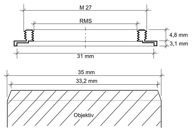 Ich suche einen Adapterring für ein Objektiv mit RMS-Gewinde auf M-27-Gewinde. Ein vorhandener Adapterring passt nicht, da er für Ojektive mit kleinerem Durchmesser angefertigt ist. Er könnte maximal Objektive unter 31 mm Ø aufnehmen. Mein Objektiv beginnt mit 33,2 mm und erweitert sich konisch auf 35 mm (siehe nachfolgende Zeichnung).