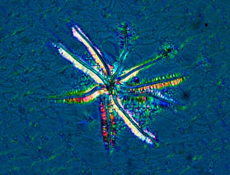 Und zu meiner Überraschung auch als "Beifang" eine pflanzliches Sternhar mit angelagerten Flüssugkristallen (450µm):