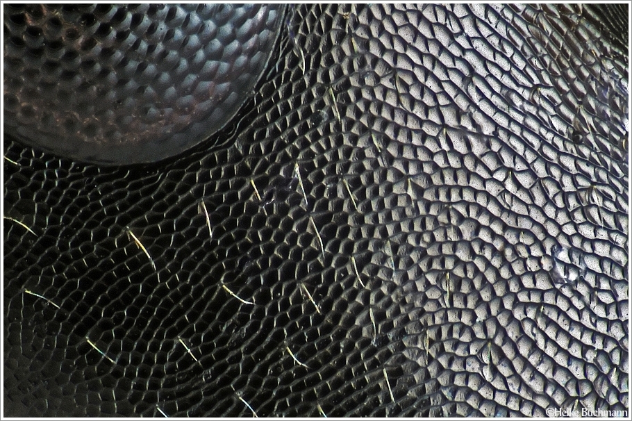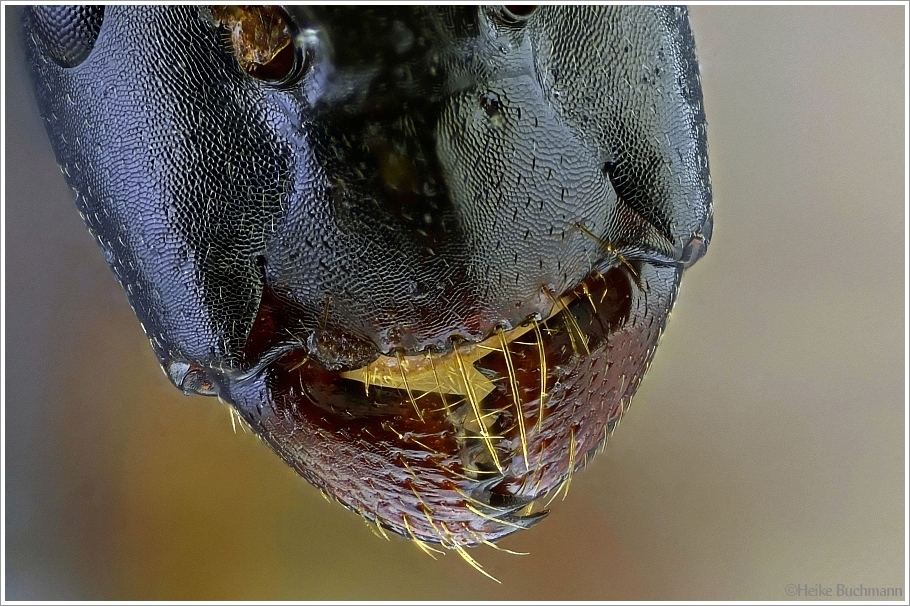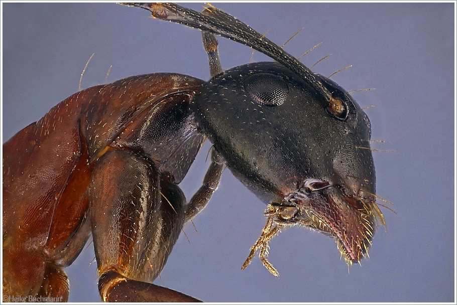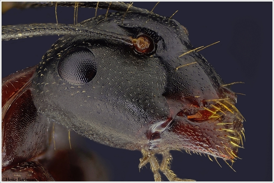 Das Komplexauge der Ameise (farblich fast identisch zum Kopf) hat mich fasziniert.