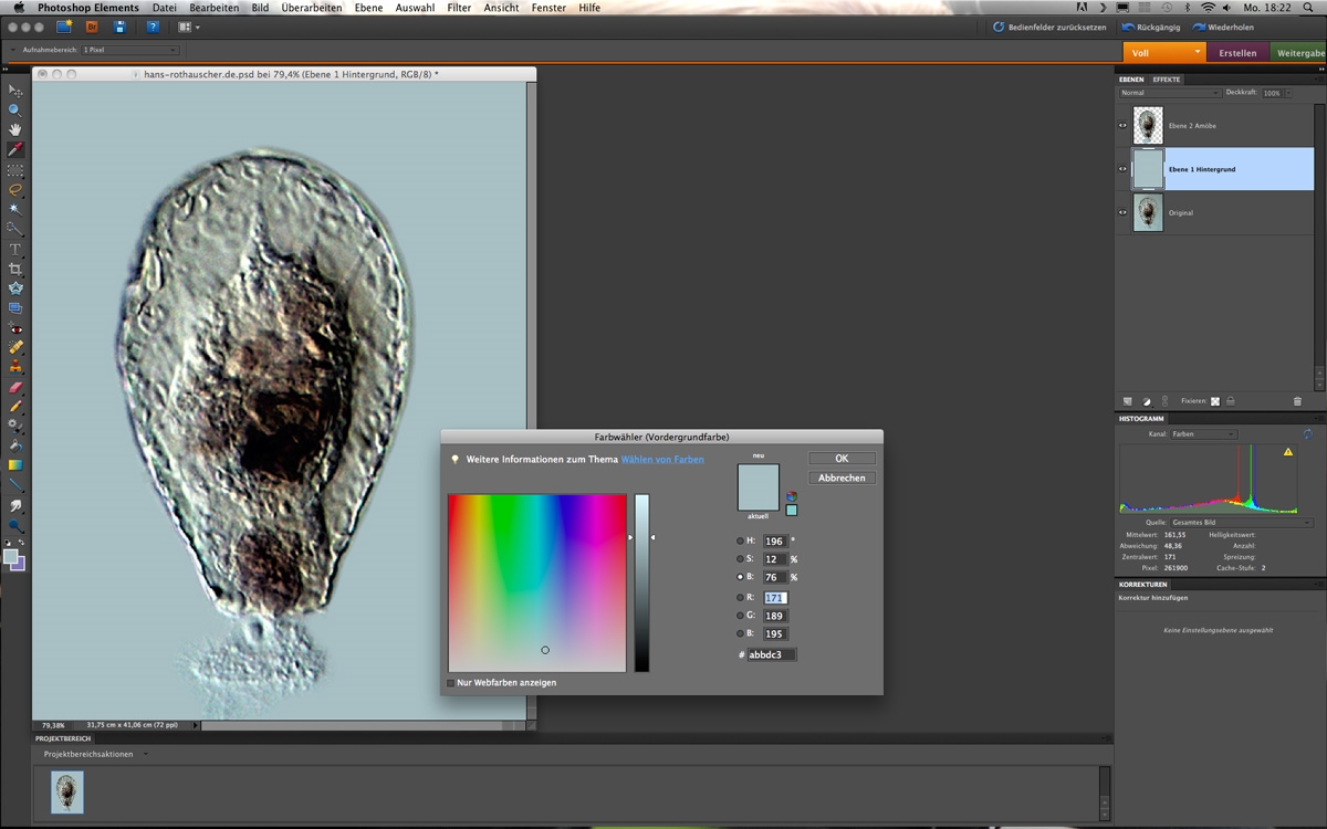 Mann könnte die Freigestellte und kopierte Amöbe auch in die neue Hintergrundebene einfügen, jedoch ist man dann nicht mehr so flexibel wenn es darum geht die Hintergrundfarbe zu ändern. Dieser Arbeitsschritt braucht keine Minute.