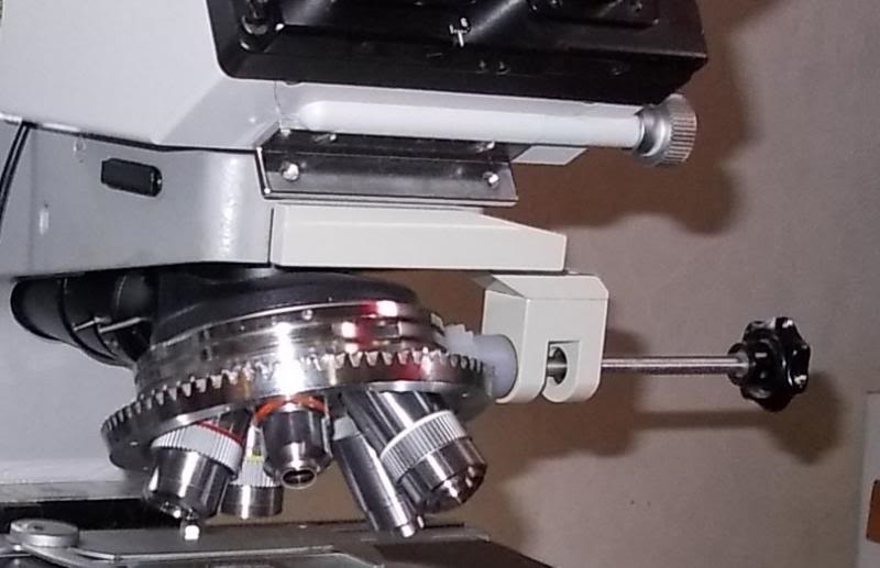 hier eine Nahaufnahme dieses Revolvers (fest verbaut mit einem HF-Auflichtimlluminator). Der Sinn erschließt sich mir auch noch nicht ganz. Ich könnte mir vorstellen, dass er bei der Prüfung "sperriger" Objekte eingesetzt wurde, bei denen das Objekt der Hand zu Wechseln des Objektivs im Weg gewesen wäre.