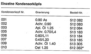 Zum "Achr. 0.90": Bei den aelteren Leitz-Kondensoren fehlt anscheinend die Angabe der Schnittweite (die Leitz-Experten moegen mich bitte korrigieren wenn ich das falsch sehe). Bei einer NA von 0,9 ist allerdings kaum etwas anderes moeglich als 1.1 oder 1.2.