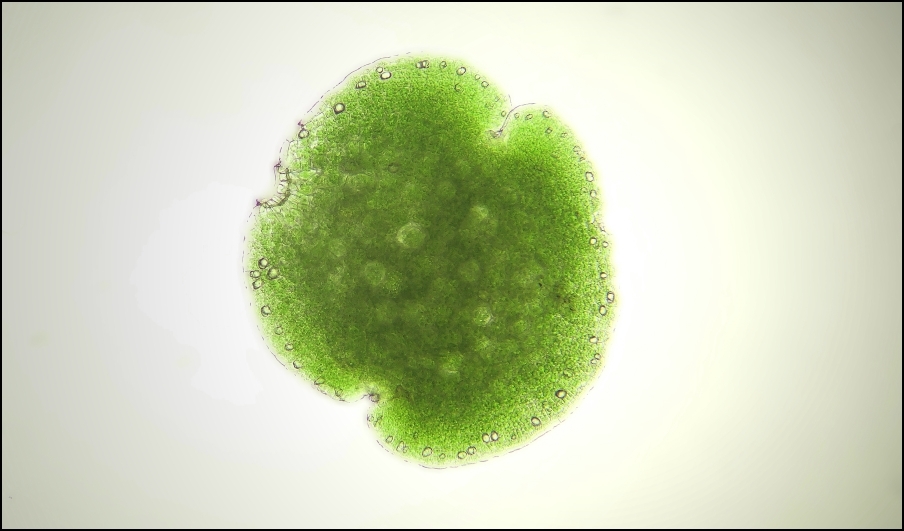 Brutkörper im Durchlicht (halbmondförmige Anwachsstelle auf 10 Uhr und Ölzellen sind zu erkennen)