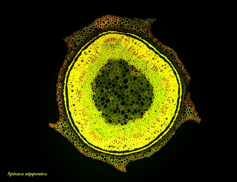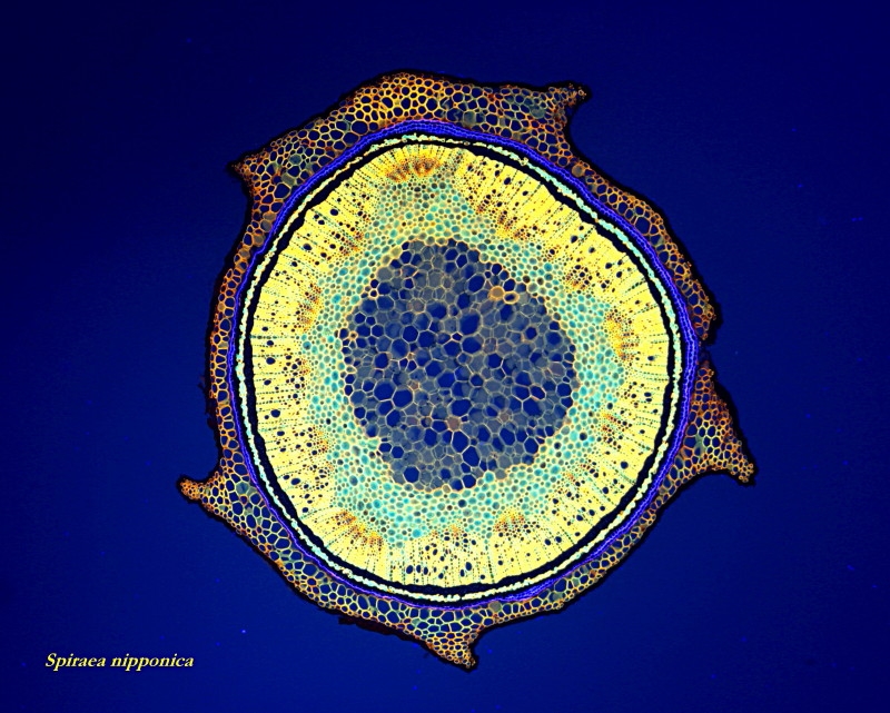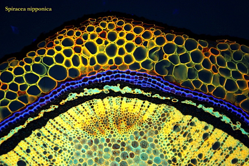 Hier der japanische Spierstrauch in UV und Blau-Anregung. Dieser feine blaue Doppelstreifen unter der Epidermis ist mir erst im Bild der UV-Anregung aufgefallen. Was könnte das sein?